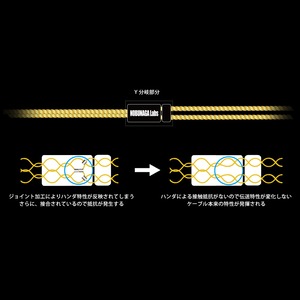 電気抵抗の原因となる分岐部分のはんだ接合工程(ジョイント加工)を施さず、ケーブルの編込みピッチを均等化することで、伝送特性が変化しない理想的な設計を実現。ケーブル本来の特性を余すことなく発揮します。